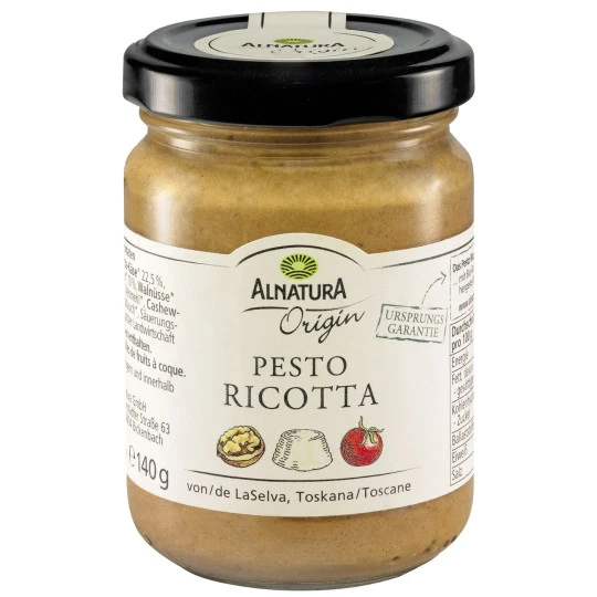 Zutatenverzeichnis: Sonnenblumenöl*, RICOTTA-KÄSE* 22%, Tomatenmark* zweifach konzentriert 11%, Tomaten* 10%, WALNÜSSE* 5%, SCHAFSKÄSE*, Reismehl*, CASHEWNÜSSE*, Basilikum*, Meersalz, Knoblauch*, Säuerungsmittel: MILCHSÄURE *aus biologischer Landwirtschaft . Kann Bruchstücke von NUSSSCHALEN enthalten.
